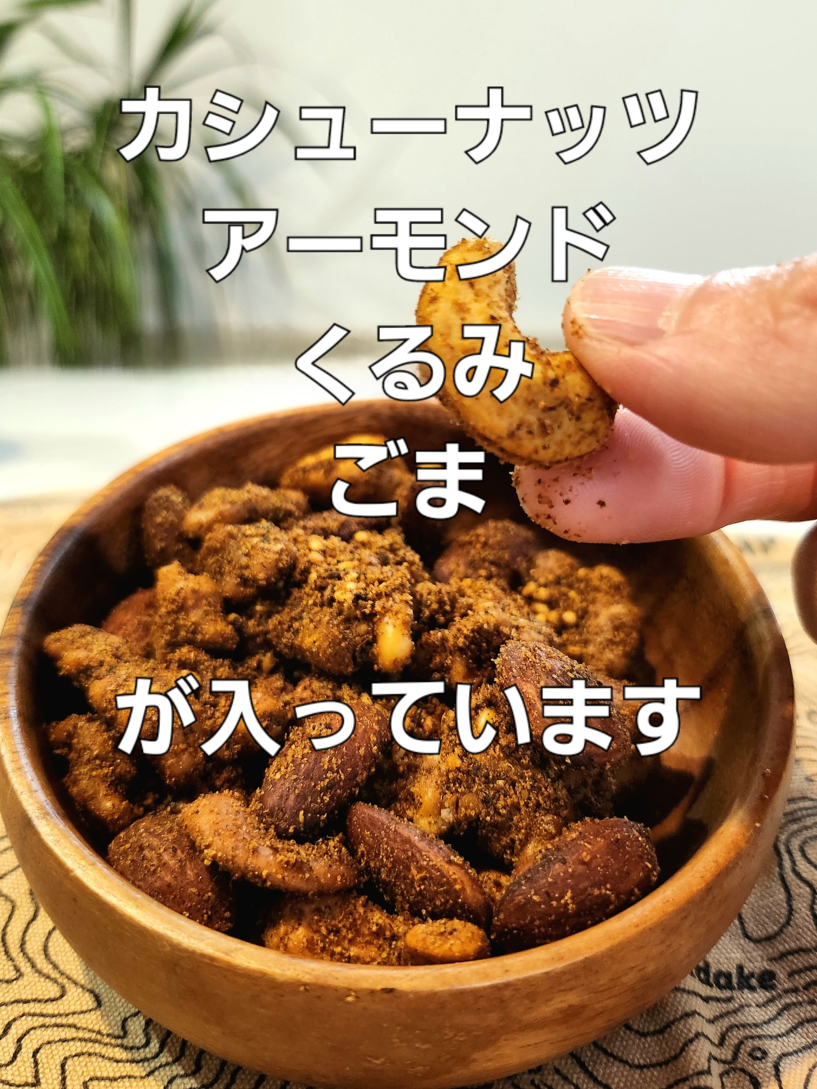 原材料:カシューナッツ、アーモンド、くるみ、ごま、クミン、コリアンダー、きび糖、ケイジャンパウダー、チリ、クローブ、タイム、オレガノ